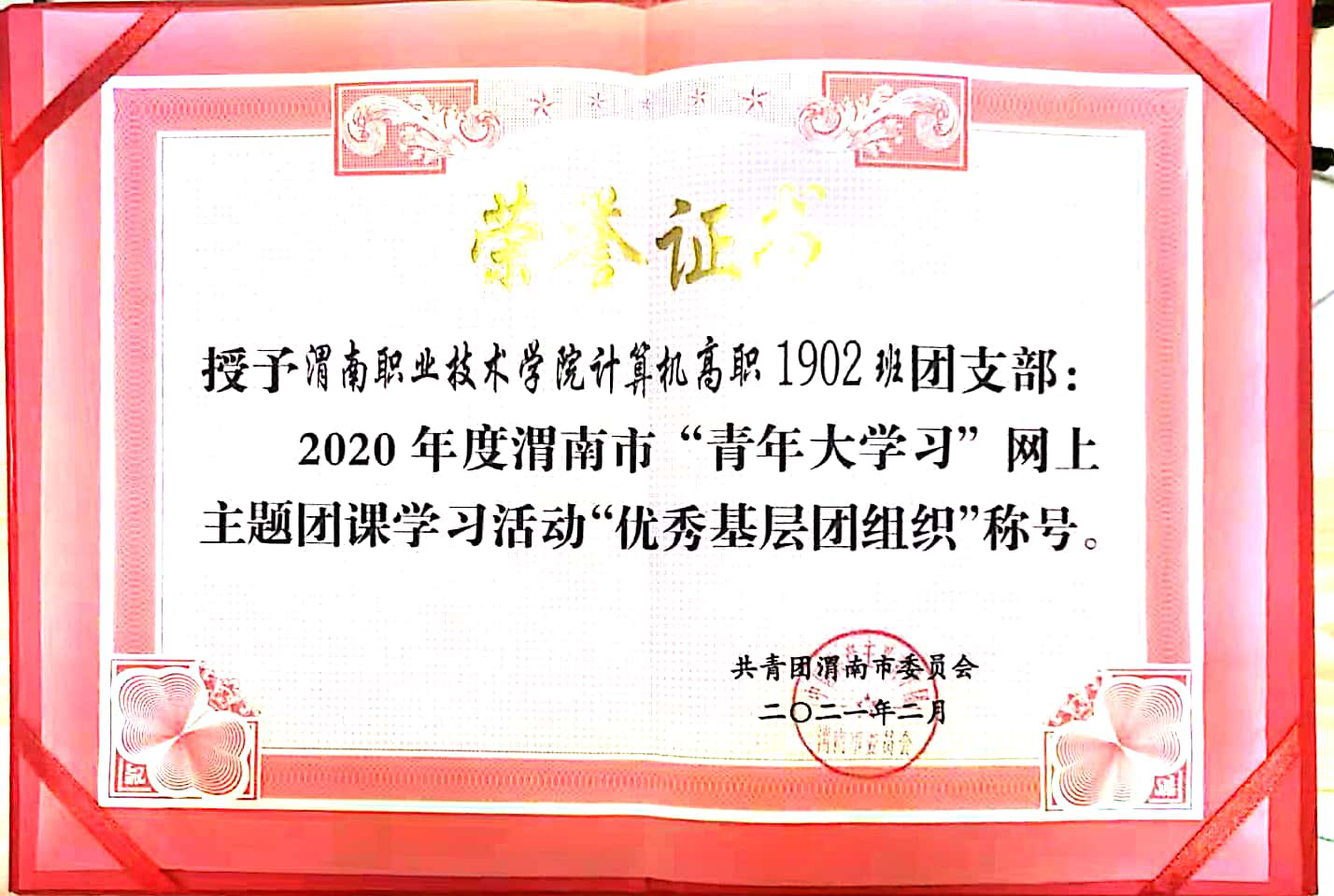 在公司太阳成集团tyc122cc员工团总支副书记赵兴琪的组织下,太阳成集团122cc官网入口计算机高职1902班团支部被授予2020年度渭南市“青年大学习”网上主题团课活动“优秀基层团组织”称号。(太阳成集团tyc122cc 贺峰鸽 审核 王医平)