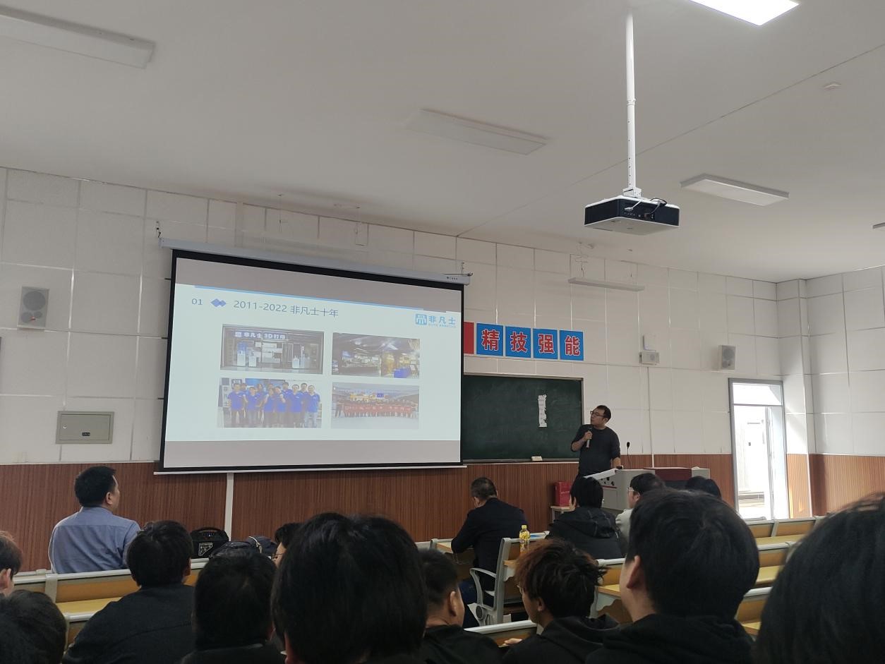 符总监结合机械、智能制造行业发展前景、人才岗位要求、企业用人标准、工艺设计、机械智能制造产品在航天航空、军工、医疗、汽车、日常生活等行业的应用进行分享,使同学们对不同领域的职业发展路径有更深入的了解。其次,他通过对非凡士三维科技有限公司的发展历程和创新创业技术、岗位需求、薪资待遇、职业发展通道、市场前景等方面,为我们剖析智能制造在3D打印行业发展形势与远景,给同学们在未来的奋斗目标和发展指明方向。罗科长针对老员工如何有效规划职业生涯、发掘个人优势和兴趣、制定切实可行的职业目标、有效沟通等方面给予重点指导,随后,他叮嘱同学们要珍惜大学时光、规划职业路径,筑梦人生精彩,奋斗精彩人生。